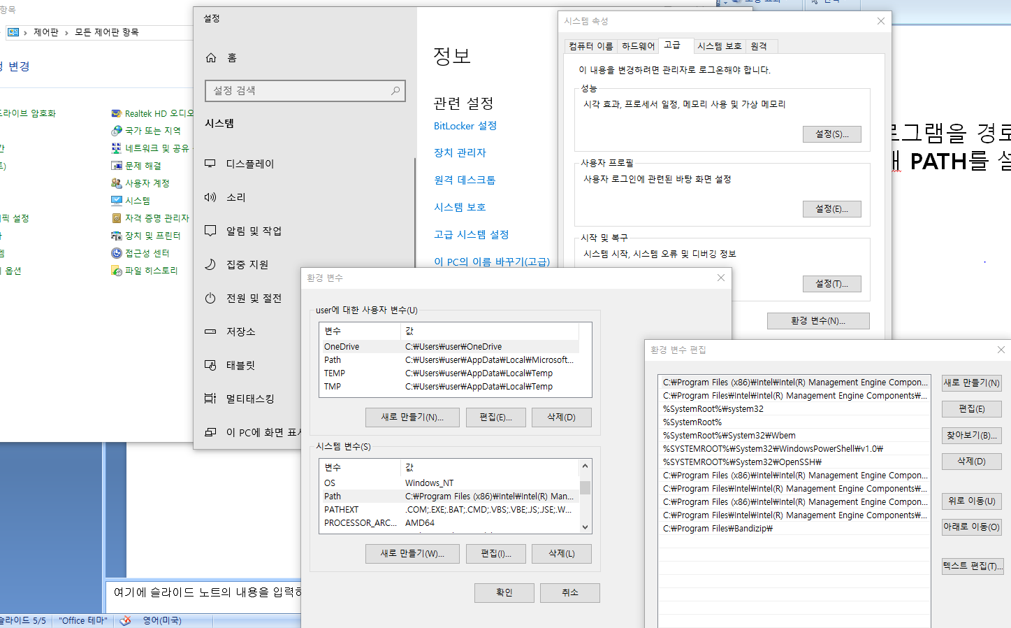 1. Windows : 제어판 > 시스템 > 고급시스템 설정 > 환경변수 > 시스템 변수 > PATH편집