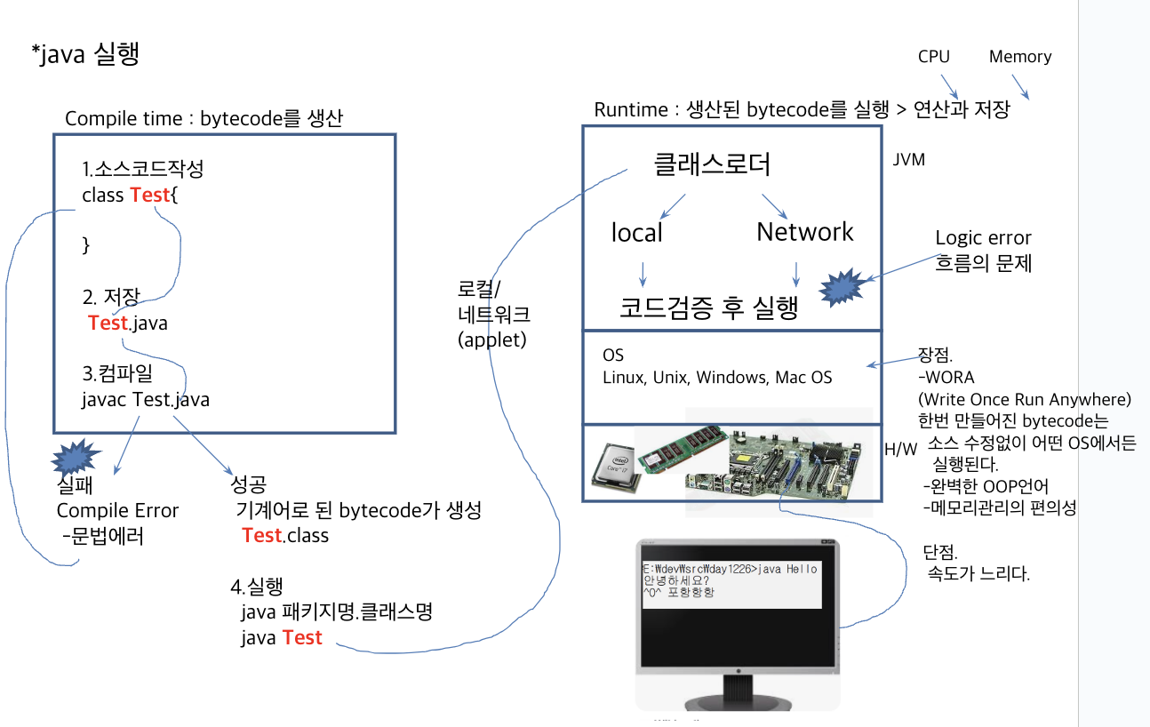 - WORA(Write Once Run Anywhere) 한 번 만들어진 bytecode는 소스 수정 없이 어떤 OS에서든 실행된다.