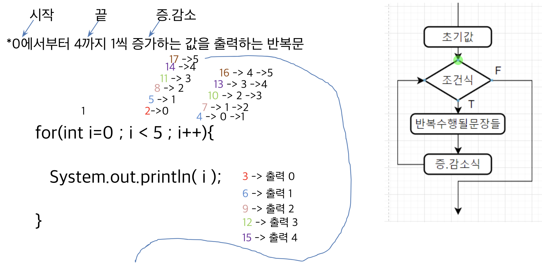 for(초기값; 조건식; 증.감소식){