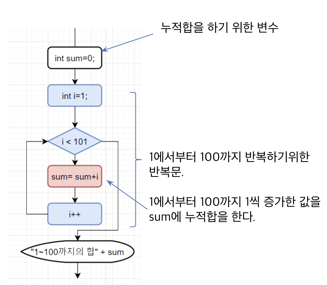 - 1에서부터 100까지의 합을 구하기 위한 코드 작성.