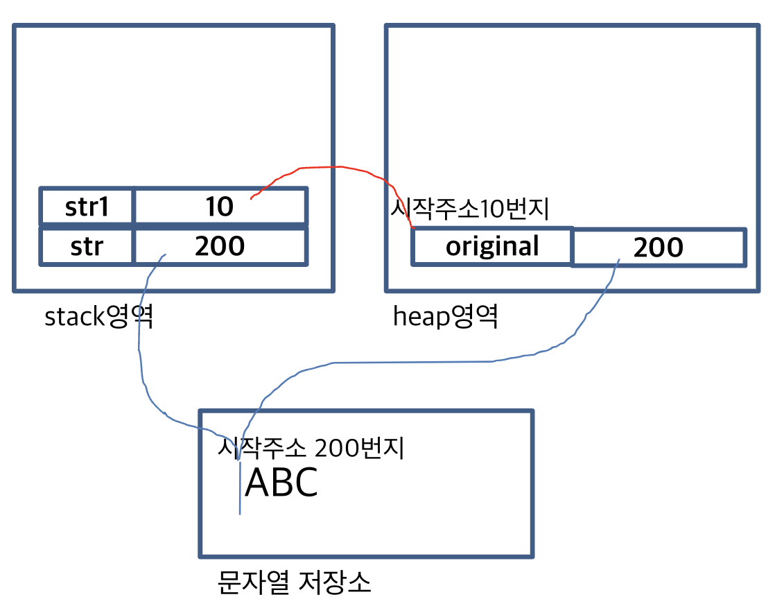 str1.equals("ABC") // heap안에 저장된 200번지와 200번지가 같은지? true