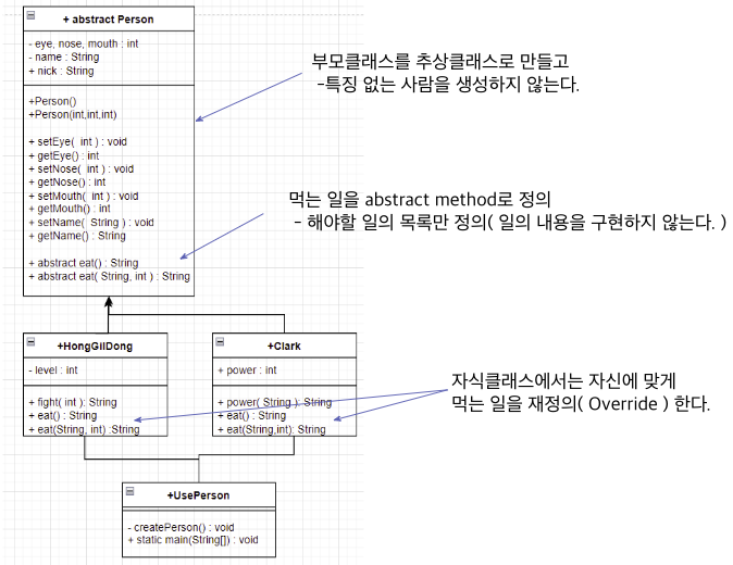 - 객체명으로는 부모 클래스의 자원(변수, method)을 사용할 수 있고, 자식 클래스가 Override한 method는 사용 가능하다.