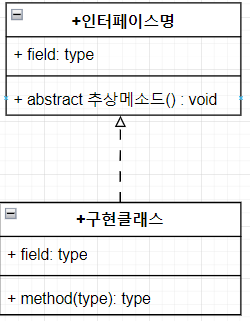 - 클래스에서 인터페이스를 구현한다. 구현하는 인터페이스 상속 줄에 있는 모든 abstract method는 구현 클래스에서 반드시 Override 해야 한다.