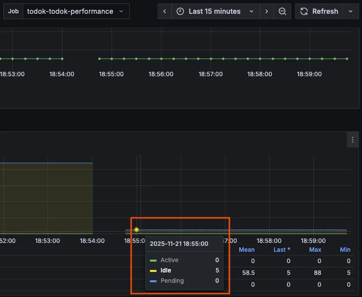 Active Connection은 max connections인 80 안에서 75까지 증가했고, pending은 11까지 존재했지만 acquire time이 거의 0에 수렴했으니, 커넥션 풀을 얻기 위해서 기다린 시간이 0.01초도 되지 않았다는 것!