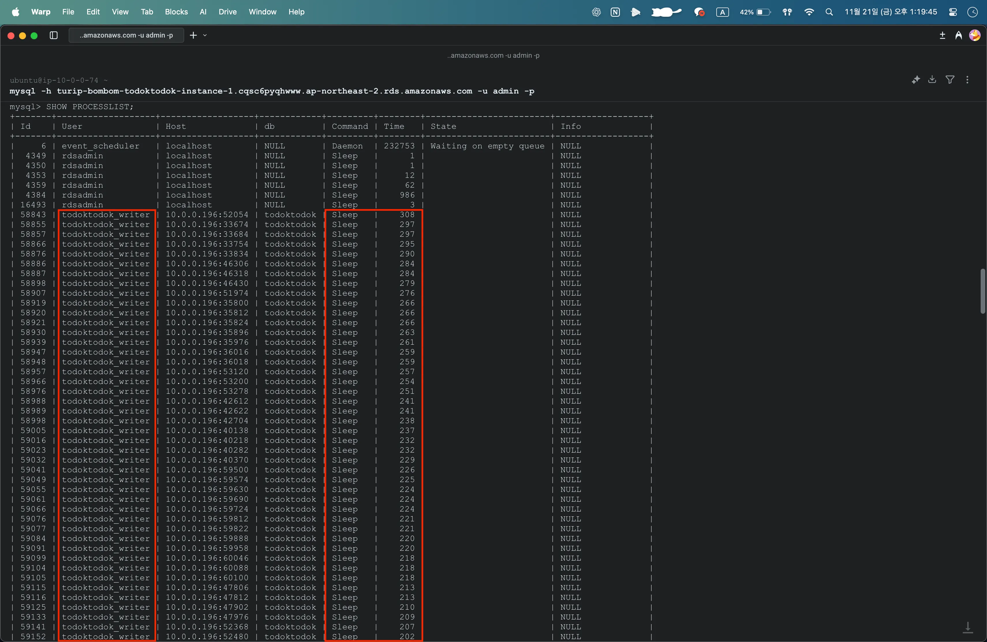 디비버로 접속했을 때 확인했던 Too many connections 를 토대로 SHOW PROCESSLIST; 명령어로 현재 프로세스를 확인했다.