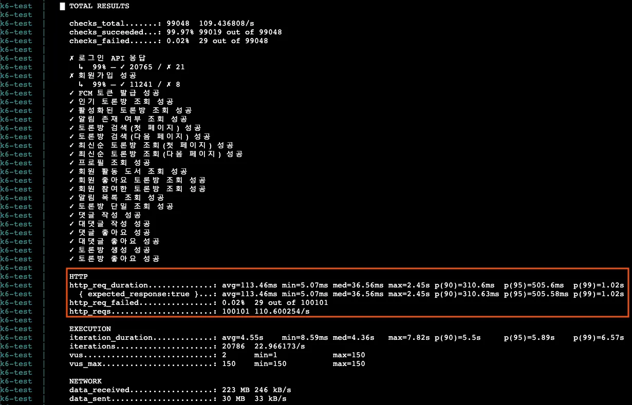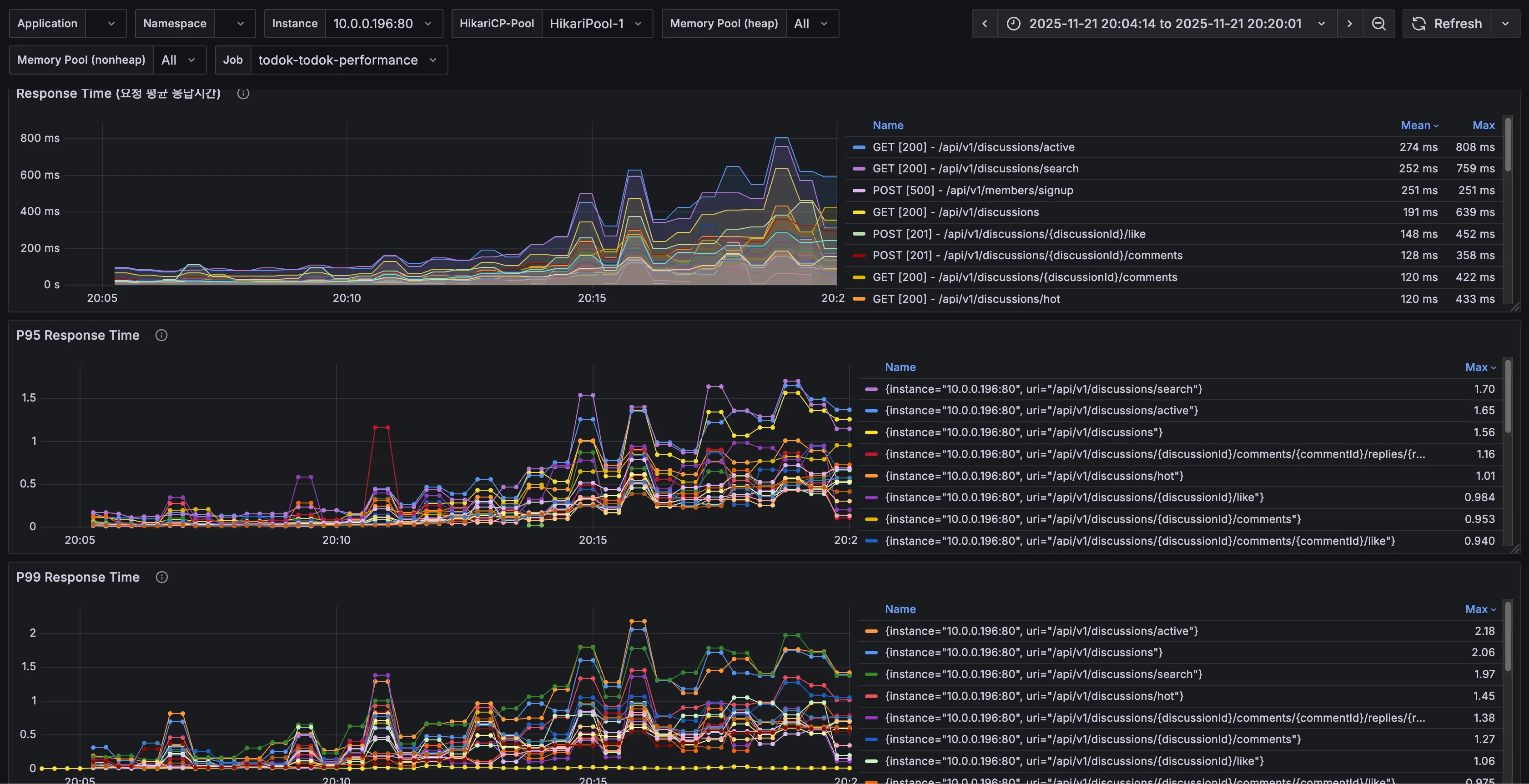 | 인기 토론방 조회(/api/v1/discussions/hot) | Avg (Max) | 1.34s | 433ms | 67.76% |